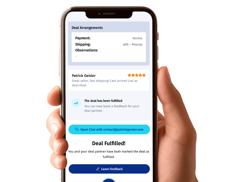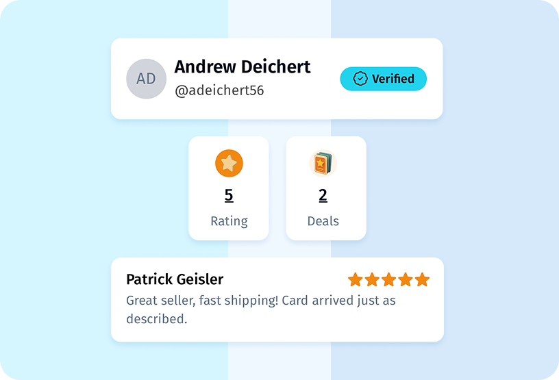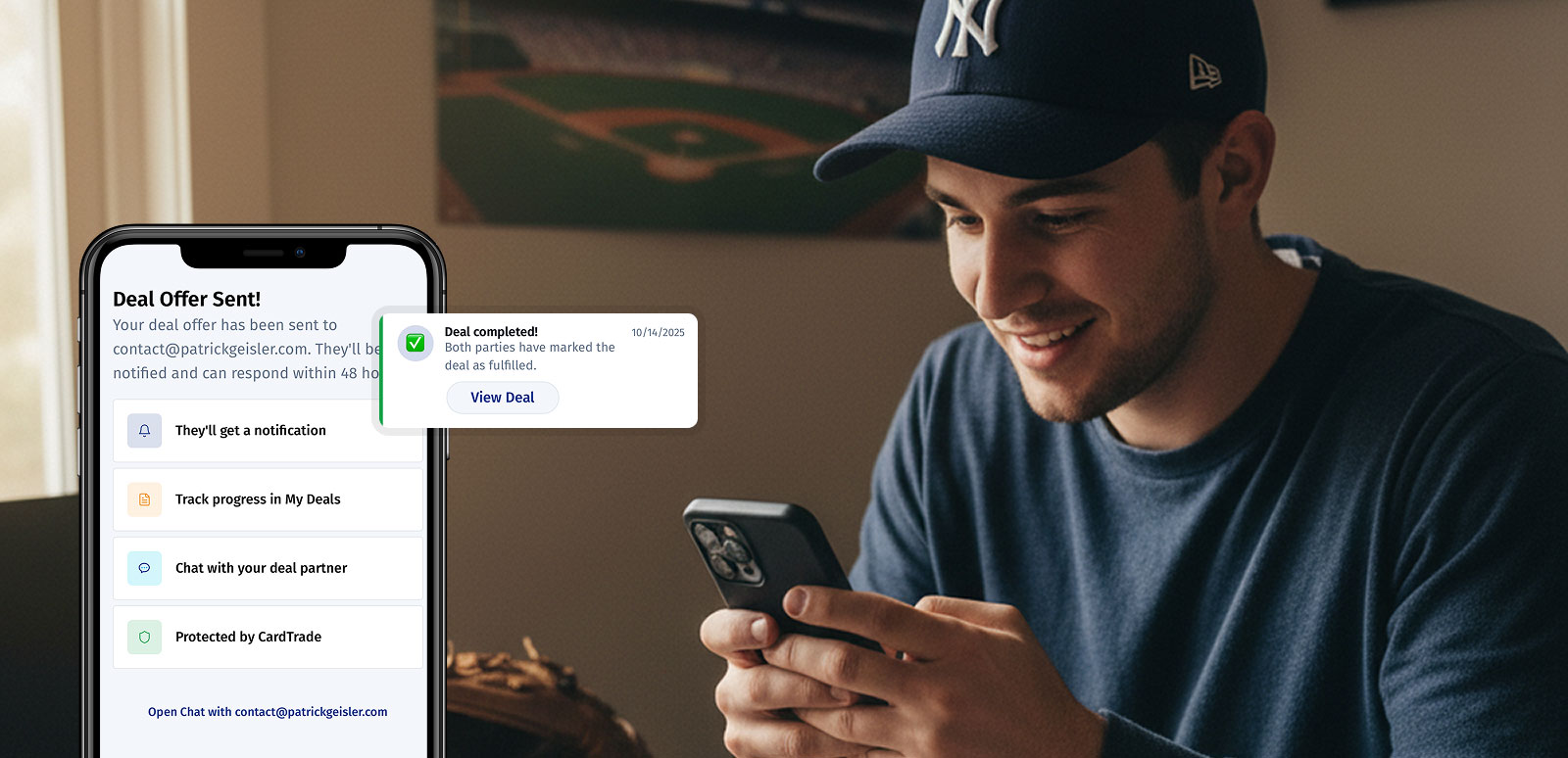 Buy, sell, or trade directly with other verified collectors — or use Card Trade to protect deals you start elsewhere.